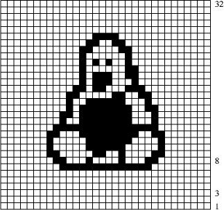 A máscara de desenho (vetor tux[]) é formada por um conjunto de números representados na forma hexadecimal. Para construir este vetor, toma-se cada linha do mapa de bits de baixo para cima. Cada 8 pixels de uma linha da figura equivalem aos bits componentes de um elemento do vetor. Os bits mais significativos ficam à esquerda e os menos significativos à direita. Seguindo esta receita, então a linha 8 da Figura 3-2, representada pela seqüência de bits 00000000110001000010001100000000, equivalerá à seqüência "0x0, 0xc4, 0x23, 0x0" do array tux[].