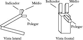 Utilizando o programa braco.c como referência, implemente um programa braco-garra.c. Este programa deverá acrescente ao braço robótico uma garra com três dedos, sendo um indicador, um médio e um polegar, como mostra a Figura 4-3. O usuário deverá poder rotacionar o dedo indicador com as teclas i e I, nos sentidos horário e anti-horário. Da mesma forma, as teclas p P deverão rotacionar o polegar, e teclas m M, o dedo médio do robô.